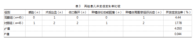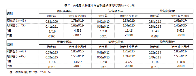 治疗6个月后,观察组种植体周围软组织情况优于对照组,差异均有统计学意义(P均<0.05)。见表2。