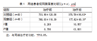 治疗后,观察组视网膜厚度小于对照组,差异有统计学意义(P<0.05)。见表1。