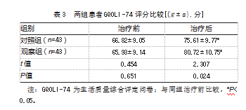 治疗后,观察组GQOLI-74评分高于对照组,差异有统计学意义(P<0.05)。见表3。