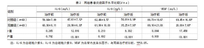 治疗后观察组IL-6、IL-8、VEGF水平均低于对照组,差异均有统计学意义(P均<0.05)。见表2。
