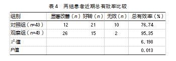 观察组近期总有效率高于对照组,差异有统计学意义(P=0.013)。见表4。