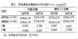 治疗后,研究组空腹血糖、餐后2 h血糖水平低于参照组,差异均有统计学意义(P均<0.05)。见表2。