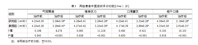 治疗后,研究组中医症状评分(气短懒言、倦怠乏力、口渴喜饮以及咽干口燥)低于参照组,差异均有统计学意义(P均<0.05)。见表3。