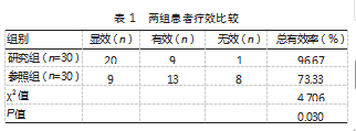 研究组总有效率为96.67%,高于参照组的73.33%,差异有统计学意义(P<0.05)。见表1。