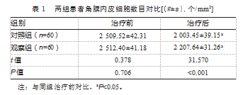 治疗后,观察组患者角膜内皮细胞数目多于对照组,差异有统计学意义(P<0.05)。见表1。