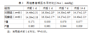 术后各时间点两组眼压水平对比,差异均无统计学意义(P均>0.05)。见表3。