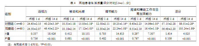 ④对比生活质量评分。分别在术后1、14 d和术后14 d采用中文版低视力者生活质量量表(Chinese-version Low Vision Quality of Life Question⁃naire,CLVQOL)[4]评估患者的生活质量水平,包括4个维度,25个条目,远视力维度共12个条目,移动和光感维度共4个条目,调节能力维度共5个条目,阅读和精细工作与日常生活能力维度共4个条目,各条目0~5分,各维度总分对应0~60分、0~20分、0~25分、0~20分,量表总分范围0~125分,分数越高,说明生活质量越好。