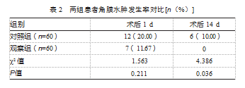 术后1 d,两组角膜水肿发生率对比,差异无统计学意义(P>0.05);术后14 d,观察组角膜水肿发生率低于对照组,差异有统计学意义(P<0.05)。见表2。