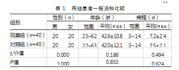 回顾性选取2021年1月—2024年1月陇南市第一人民医院神经内科收治的80例面神经炎患者的临床资料,按不同治疗方案分为两组。观察组(40例)使用mNGF和糖皮质激素联合治疗,对照组(40例)使用糖皮质激素治疗。两组患者一般资料比较,差异均无统计学意义(P均>0.05),具有可比性。见表1。本研究经陇南市第一人民医院伦理委员会批准(L202424)。