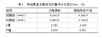 ②主要症状改善评分:对面神经麻痹的主要症状进行单独评分,包括口角歪斜、眼睑闭合不全。口角歪斜程度评分0~5分(从“严重歪斜”到“正常”);眼睑闭合不全评分0~5分(从“完全无法闭合”到“完全正常闭合”)。