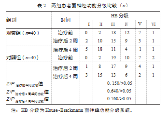 治疗前、治疗后2周、治疗后4周,两组HB分级比较,差异均无统计学意义(P均>0.05)。见表2。