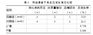 ③不良反应发生情况:观察并记录两组患者在治疗过程中出现的不良反应,包括消化系统反应、体质量增加、血糖波动。