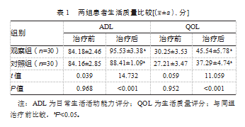 观察组患者ADL、QOL评分高于对照组,差异均有统计学意义(P均<0.05)。见表1。