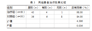 治疗组患者治疗总有效率为98.00%(49/50),优于对照组的84.00%(42/50),差异有统计学意义(χ2=4.396,P<0.05)。见表3。