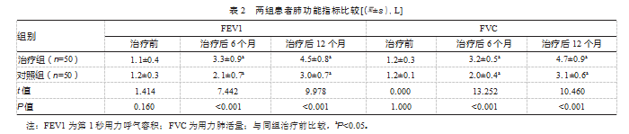 治疗后6个月及12个月,治疗组患者第1秒用力呼气量和用力肺活量均优于对照组,差异均有统计学意义(P均<0.05)。见表2。