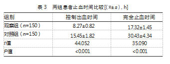 观察组控制出血时间、完全止血时间更短,差异均有统计学意义(P均<0.05)。见表3。