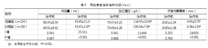 治疗后,两组患者月经量减少,血红蛋白水平上升,子宫内膜厚度变薄,且观察组优于对照组,差异均有统计学意义(P均<0.05)。见表4。