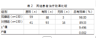 观察组治疗有效率为98.00%,高于对照组的89.33%,差异有统计学意义(P<0.05)。见表2。