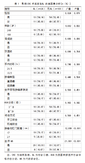 多因素分析:采用多因素Logistic回归方法分析影响CRC术后发生AL的独立因素。