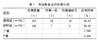 研析组治疗总有效率较参照组更高,差异有统计学意义(P<0.05)。见表1。