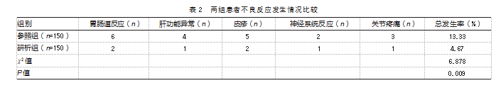 两组患者不良反应发生情况比较。观察并记录两组患者用药期间出现的不良反应情况,如胃肠道反应、肝功能异常、皮疹、神经系统反应、关节疼痛,计算不良反应总发生率,评估两组用药安全性。