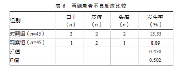 观察组口干、皮疹、头痛不良反应发生率低于对照组,但差异无统计学意义(P>0.05)。见表6。