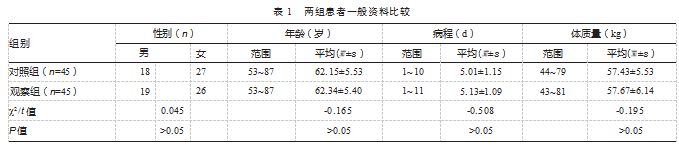 目的选取2025年1—4月梨树县中医院收治的90例类风湿关节炎患者为研究对象,根据治疗方法不同分为两组,每组45例,对照组应用针灸疗法,观察组联合麻黄加术汤加减方进行治疗。两组患者一般资料对比,差异均无统计学意义(P均>0.05),具有可比性。见表1。本研究经梨树县中医院伦理委员会审核批准(梨中伦委LZ-03-04)。患者及家属对本研究知情同意。