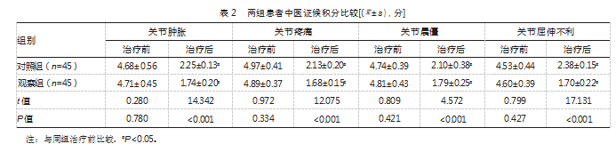 治疗前,两组患者关节肿胀、疼痛、晨僵、屈伸不利积分比较,差异均无统计学意义(P均>0.05)。治疗后,两组患者各项中医证候积分低于治疗前,观察组低于对照组,差异均有统计学意义(P均<0.05)。见表2。