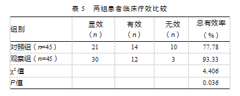 对比两组治疗总有效率水平,观察组较对照组更高,差异有统计学意义(P<0.05)。见表5。