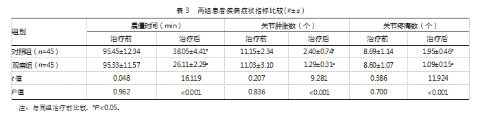 治疗前,两组患者晨僵时间、关节肿胀数、关节疼痛数比较,差异均无统计学意义(P均>0.05)。治疗后,两组患者晨僵时间缩短,观察组短于对照组,两组关节肿胀数、疼痛数减少,观察组少于对照组,差异均有统计学意义(P均<0.05)。见表3。