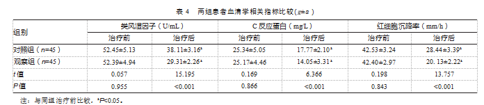 ③血清学相关指标。治疗前后采集3 mL空腹静脉血,离心后(离心半径:10 cm,转速:3 000 r/min,时间:10 min)获取上测过血清,实施免疫比浊法检测类风湿因子水平和C反应蛋白水平,实施魏氏法检测红细胞沉降率。