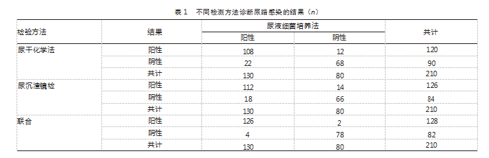 尿路感染是细菌、病毒或真菌侵入泌尿系统引起的炎症反应,尿路感染的表现有尿频、下腹坠胀感、发热、寒战等症状[1-2]。根据相关的资料可知,尿路感染的发病率位居呼吸道感染之后,患者数量持续攀升,因此必须尽早地进行病情的判定,以提高患者的生活质量[3]。目前尿路感染的诊断方法有尿常规、尿培养+药敏试验、尿PCR检测、尿沉渣镜检,尿常规诊断方式有快速、成本低、能初步判断感染的优势,但是其特异性比较低,更不能确定病原体。尿培养+药敏试验有明确致病菌、指导抗生素用药、鉴别耐药菌的优势,但耗时比较长,且成本高。尿PCR检测的优势是快速、高灵敏度,但是成本比较高,并没有在医院普及[4]。尿沉渣镜检能直接观察细菌、白细胞、红细胞,但是敏感性比较低。对此,本文旨在分析尿常规检验中尿干化学法联合尿沉渣法诊断尿路感染的效果及特异度、灵敏度,现报道如下。