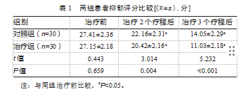 治疗2、3个疗程后,两组抑郁评分均低于治疗前,且治疗组低于对照组,差异均有统计学意义(P均<0.05)。见表1。