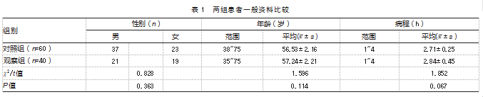 便利选取2023年1月—2024年1月甘肃景泰县中医医院普外科和兰州大学第二医院普外科收诊的100例急性胆囊炎患者为研究对象,根据不同的手术方式进行分组,对照组60例(接受单一的腹腔镜下胆囊切除术),观察组40例(接受超声引导下经皮经肝胆囊穿刺引流术+择期腹腔镜下胆囊切除术)。两组患者一般资料对比,差异均无统计学意义(P均>0.05),具有可比性,见表1。本研究经甘肃景泰县中医医院伦理委员会审核批准(2025002)。