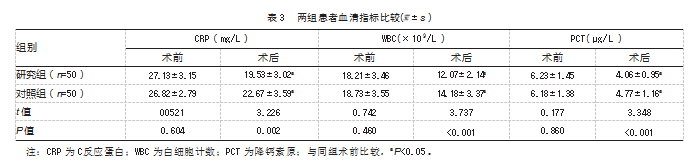 术后,两组CRP、WBC、PCT水平均下降,且研究组较对照组更低,差异均有统计学意义(P均<0.05)。见表3。
