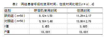 研究组呼吸机使用时间、住院时间较对照组更短,差异均有统计学意义(P均<0.05)。见表2。