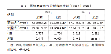 术后,两组PaO2有所升高,PaCO2有所下降,但研究组PaO2较对照组更高、PaCO2较对照组更低,差异均有统计学意义(P均<0.05)。见表4。