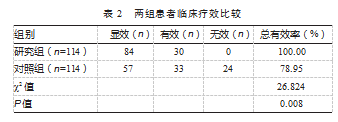 研究组治疗总有效率高于对照组,差异有统计学意义(P<0.05)。见表2。