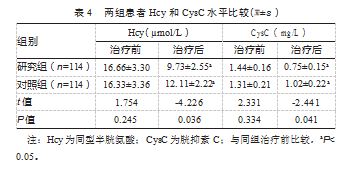 治疗后,研究组Hcy和CysC水平均低于对照组,差异均有统计学意义(P均<0.05)。见表4。