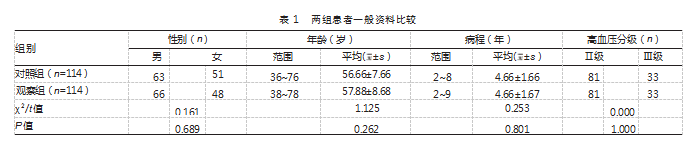 目的抽取2023年3月—2024年3月麻城市人民医院诊治的228例高血压患者,按照治疗方法不同分两组,每组114例。两组患者一般资料对比,差异均无统计学意义(P均>0.05),具有可比性。见表1。本研究经麻城市人民医伦理委员会审核批准(MC20240524)。