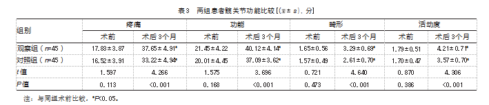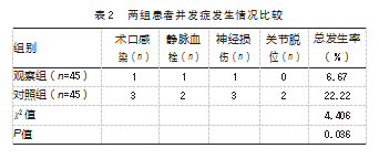 ②并发症发生情况。记录并对比两组患者术后出现的并发症发生情况,包括术口感染、静脉血栓、神经损伤、关节脱位等。
