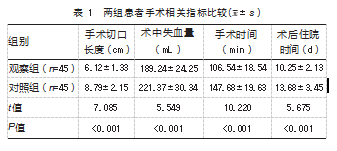 观察组各项手术相关指标均优于对照组,差异均有统计学意义(P均<0.05)。见表1。