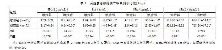 治疗前,两组细胞凋亡相关因子比较,差异均无统计学意义(P均>0.05);治疗后,两组Bcl-2均降低,观察组更低;Bax、sFas、sFasL两组均升高,观察组更高,差异均有统计学意义(P均<0.05)。见表3。
