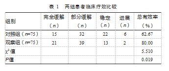 两组临床疗效比较。均在治疗后6个月参照实体瘤疗效判定标准[6]。病灶全部消失即完全缓解;病灶体积缩小≥50%为部分缓解;肿块体积缩小20%~<50%即稳定;肿块体积缩小<20%或增加或有肿块为进展。总有效率=完全缓解率+部分缓解率。