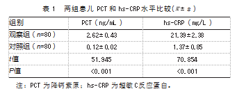 观察组PCT和hs-CRP水平高于对照组,差异均有统计学意义(P均<0.05)。见表1。