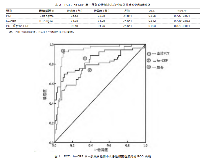 综上所述,PCT和hs-CRP联合检验不仅能够有效进行健康儿童和小儿急性细菌性肺炎患儿的区分,从而能够为患者的早期诊断和对症干预治疗提供重要的资料参考,应用价值较高。