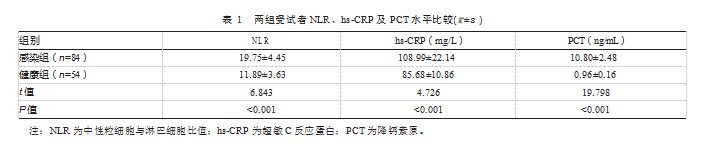 2.1两组受试者NLR、hs-CRP及PCT水平比较