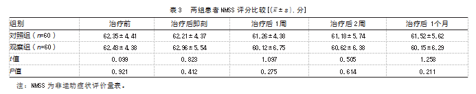 治疗前及治疗后各时间点,两组患者的NMSS评分比较,差异均无统计学意义(P均>0.05)。见表3。