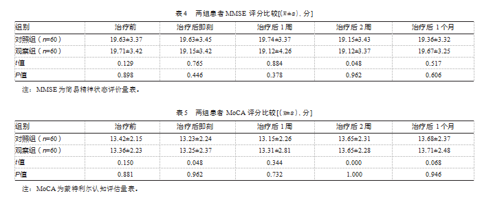 两组治疗前及治疗后MMSE评分和MoCA评分比较,差异均无统计学意义(P均>0.05)。见表4、表5。