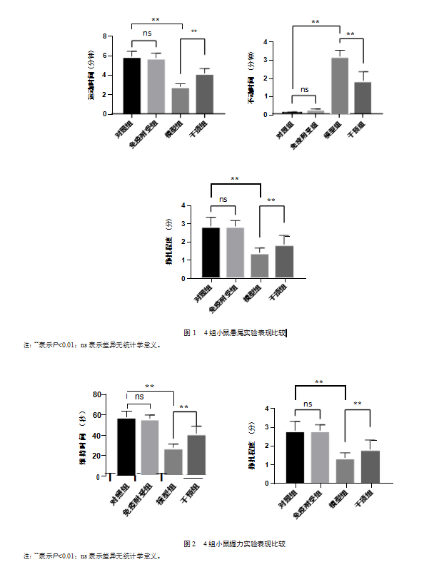 2.1.1悬尾实验在悬尾实验中,模型组小鼠表现出显著的动作缓慢和迟钝现象,而其他组未见此现象。与对照组相比,模型组的不动时间增加、运动时间和挣扎程度降低,差异均有统计学意义(q=8.24,7.65,6.92;P均<0.01)。免疫耐受组与对照组的运动时间、不动时间、挣扎程度相比,差异均无统计学意义(q=1.23,0.98,0.55;P=0.427,0.443,1.000)。与模型组相比,干预组的不动时间显著减少、运动时间和挣扎程度均显著增加,差异均有统计学意义(q=7.89,6.45,5.82;P均<0.01)。见图1。2.1.2握力实验在握力实验中,模型组小鼠在实验过程中表现出肢体僵硬、姿态不稳及震颤现象,而其他组未见明显异常。与对照组相比,模型组小鼠保持在绳子上维持时间显著缩短、挣扎程度减弱,差异均有统计学意义(q=9.37,8.65;P均<0.01)。免疫耐受组与对照组维持时间、挣扎程度相比,差异均无统计学意义(q=0.72,1.52;P=0.836,0.372)。与模型组相比,干预组小鼠维持时间延长、挣扎程度改善,差异均有统计学意义(q=7.89,6.94;P均<0.01)。见图2。